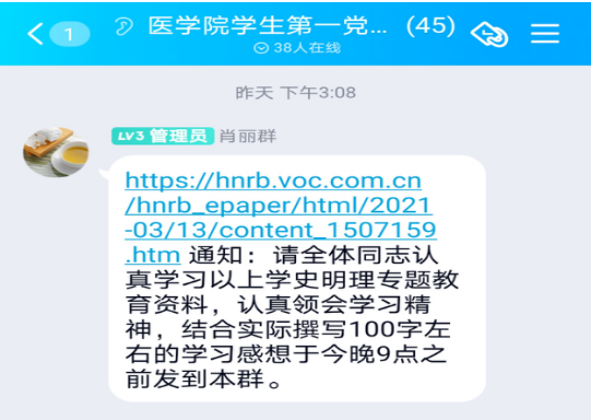 今年是中国共产党成立100周年。百年波澜壮阔,百年春华秋实,中国共产党人初心不改、使命不变。为了更好的学习党史,明确责任担当,邵阳学院医学院学生第一党支部于42日3点组织党员开展以“学史明理”为主题的线上专题学习,切实做到学史明理,知史明责。本次党史学习教育由肖丽群书记主持,全体党员参加。
