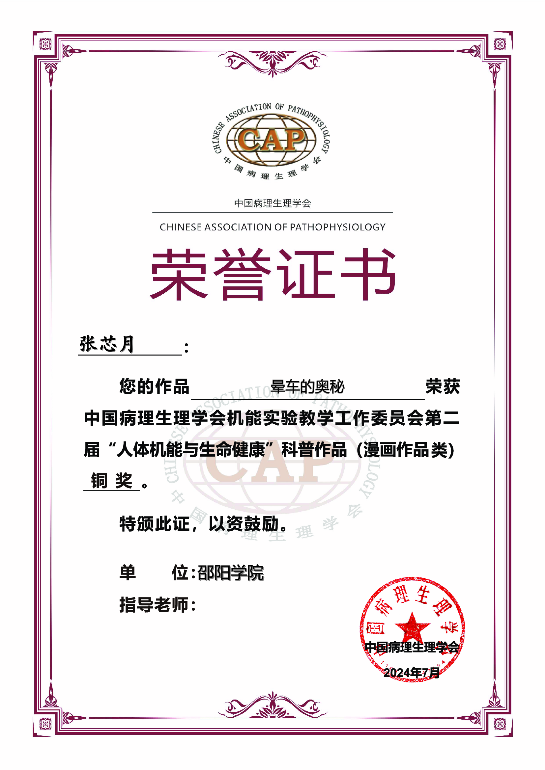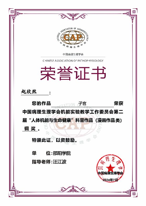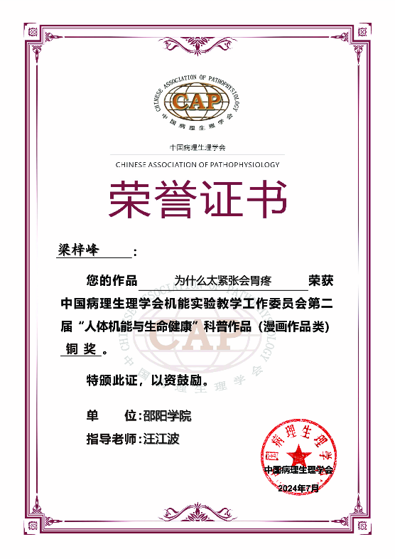 比赛自3月份启动以来,病理学与病理生理学教研室全体教师积极发动学生借力信息化手段和美术技巧,融入机能学学科知识,将深奥的医学知识通俗易懂、生动形象地以视频或漫画的形式表现出来。经过精心指导和反复打磨,我院遴选了一批优秀作品参赛。最终,我院选送的视频类和漫画类作品通过层层筛选和专家评审,获得铜奖4项的好成绩。据悉我校获奖的四件作品在第十届全国机能实验教学研讨会上展示,获得了与会专家的好评。