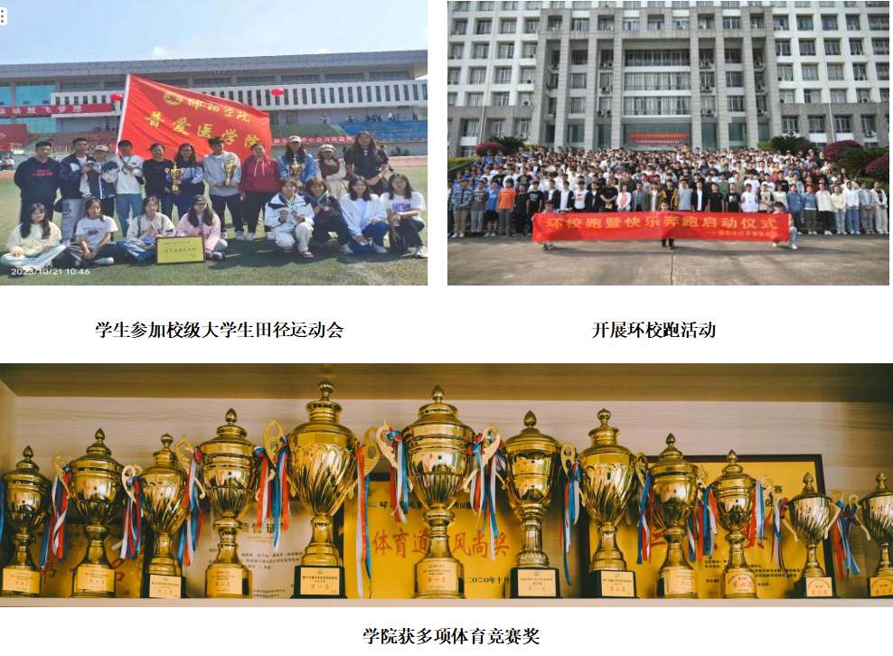 以体强身,学生积极参加各类体育竞赛,开展健康环校跑、“快乐奔跑”每日运动等活动,引导学生保持积极健康的良好生活状态。学院获校级男子篮球联赛第一、女子排球联赛连续两年蝉联冠军、大学生田径运动会中第二名和道德风尚奖等多项殊荣。以美润心,开展寝室美化大赛、解剖绘图大赛等丰富的美育活动,加强学生艺术文化素养。以劳立行,落实大学生劳动教育的要求,结合社会实践、学科专业开展劳动实践,依托三下乡活动、志愿服务等途径,强化学生劳动意识,丰富劳动体验,提升综合能力。