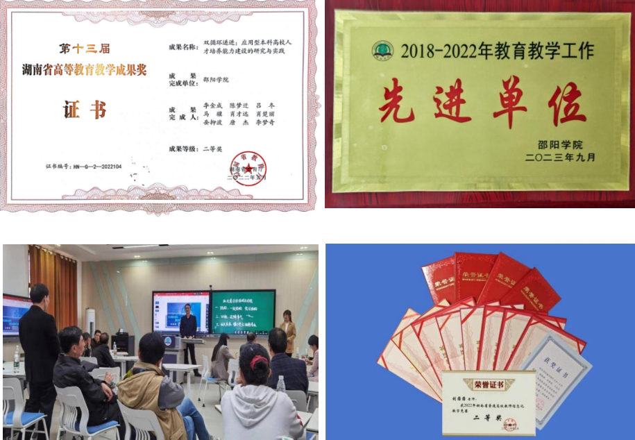 课程建设的关键是师资,学院以课程建设为抓手,加强教学团队建设,通过集体备课磨课、教学公开示范课、专家讲座、专项培训、集体研修等活动提升教师教学能力。近五年获湖南省信息化教学竞赛二等奖、教学创新大赛三等奖等省校级教学竞赛奖30余项,2023年获评校级“教育教学工作先进单位”。