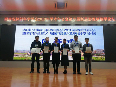 为展示和交流湖南省解剖科学学会各会员单位和会员在相关领域中最新的研究成果,进一步促进我省解剖学与组织胚胎学学科发展,2018 年 12 月 14 日~17 日在长沙举办了湖南省解剖科学学会 2018 年学术年会暨湖南省第六届断层影像解剖学论坛,会议由湖南省解剖科学学会主办,中南大学基础医学院承办。会议邀请了苏国辉院士和省内外著名专家学者与会并作大会报告,同时举办了青年教师论坛、学生论坛、青年教师微课竞赛、解剖学手绘图竞赛、标本制作比赛等。我校医学院副院长肖楚丽,解剖与组胚教研室和医学形态中心的李艳伟、曹妍群、刘冬强、江汉臣4位教师,2016级临床医学本科生陈胜同学,参加了此次学术盛会。