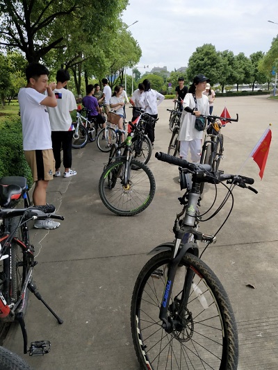 65日中午12:20,在举行了简短的出发仪式之后,骑行队从梅子井校区大门口出发,开始了环保宣传的骑行。骑手由学生会部分干事志愿组成,在每辆自行车上都插有“节约环保”字样的小旗帜