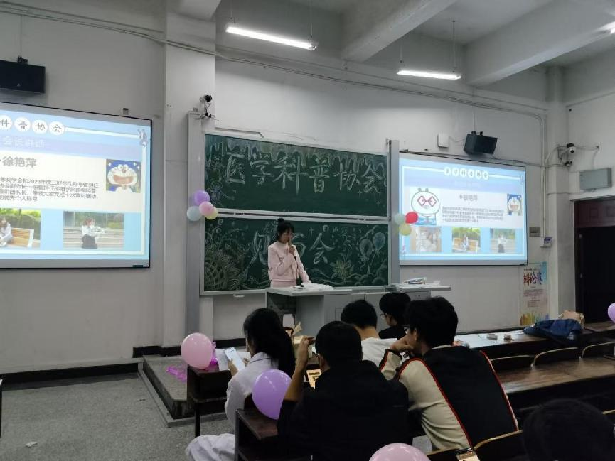 见面会现场气氛热烈,活力满满。会长徐艳萍首先发表了热情洋溢的致辞,对新成员的加入致以热烈欢迎,并详细介绍了医学科普协会的宗旨、目标以及过往所取得的辉煌成就。徐艳萍会长强调,医学科普协会致力于将专业的医学知识以通俗易懂的方式传播给大众,提高公众的健康素养与自我保健能力,并在实践活动中提升同学们的专业素养、医学人文思想和语言表达能力。