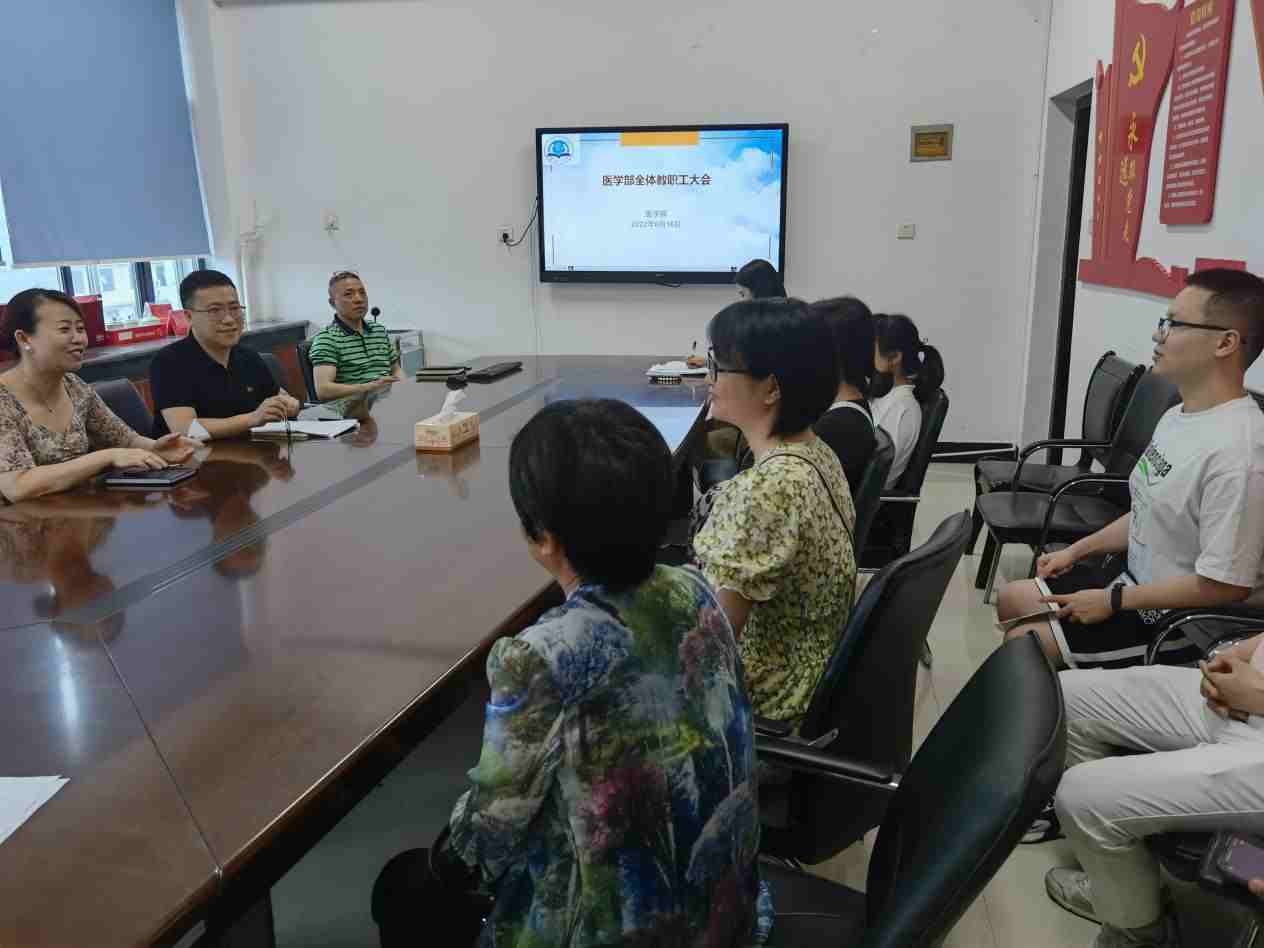 6月16日下午,医学部全体成员在二办619会议室召开2022年上学期全体教职工大会,会议由医学部党工委常务副书记、医学部直属党支部书记黄俊主持,医学部党政班子、教职工共17人参加会议。
