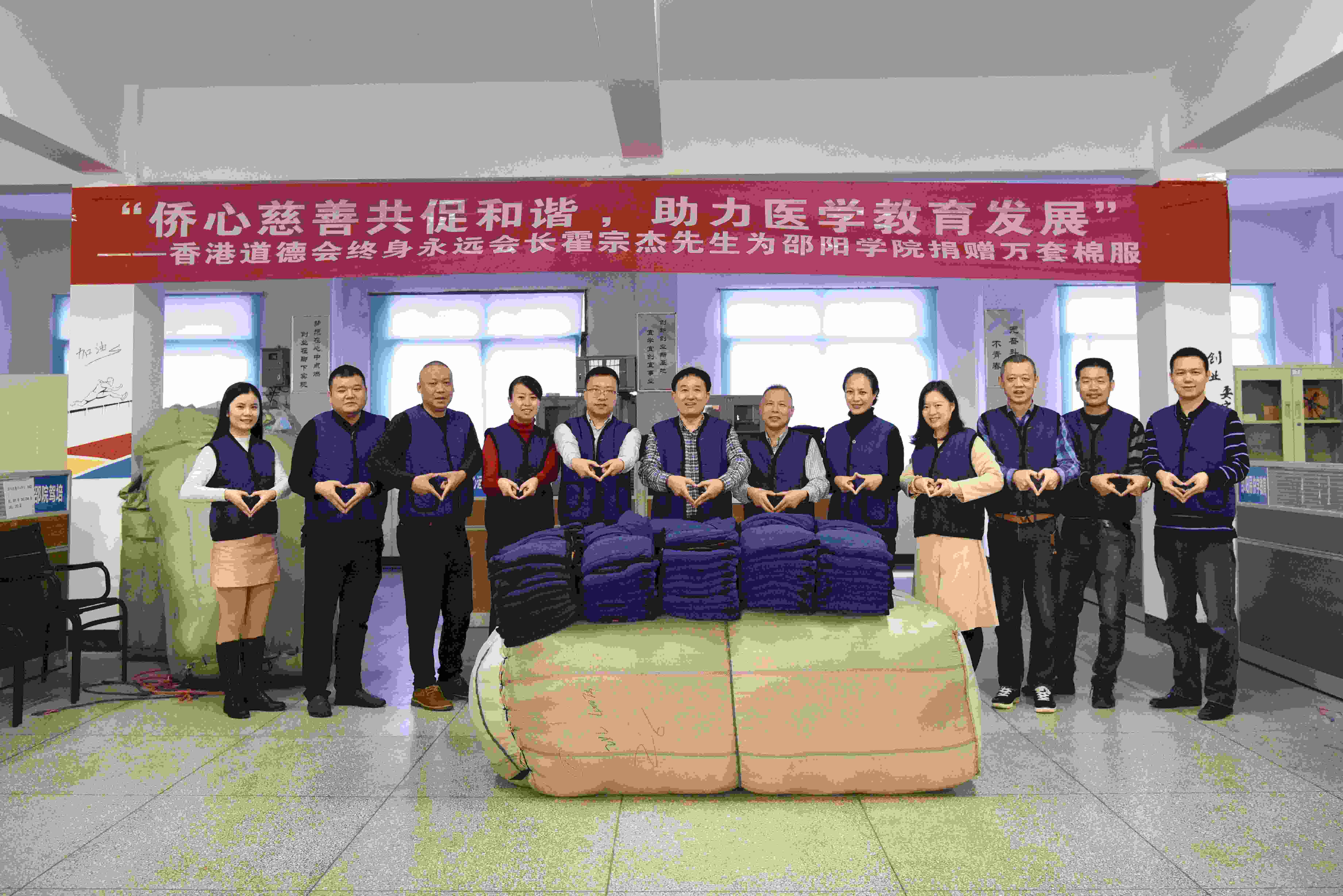 为促进我校医学教育事业发展,香港道德会终身永远会长霍宗杰先生向我校捐赠万套棉背心。11月2日上午10点,捐赠仪式在七里坪校区厚德楼一楼举行,党委委员、副校长、医学部主任李金成教授出席本次仪式并讲话,党政办公室、纪委、医学部及两个附属医院相关负责人参加了仪式。